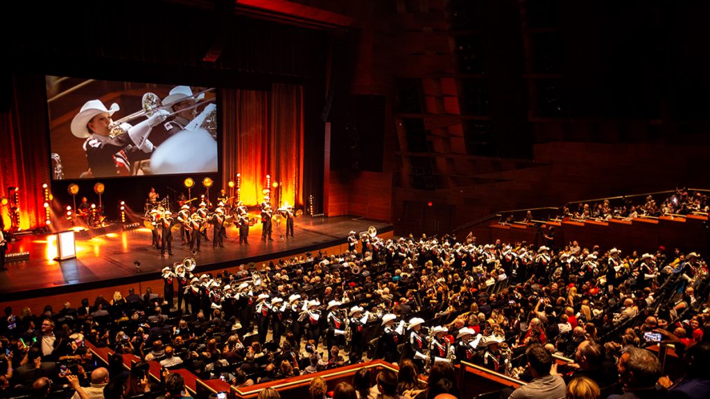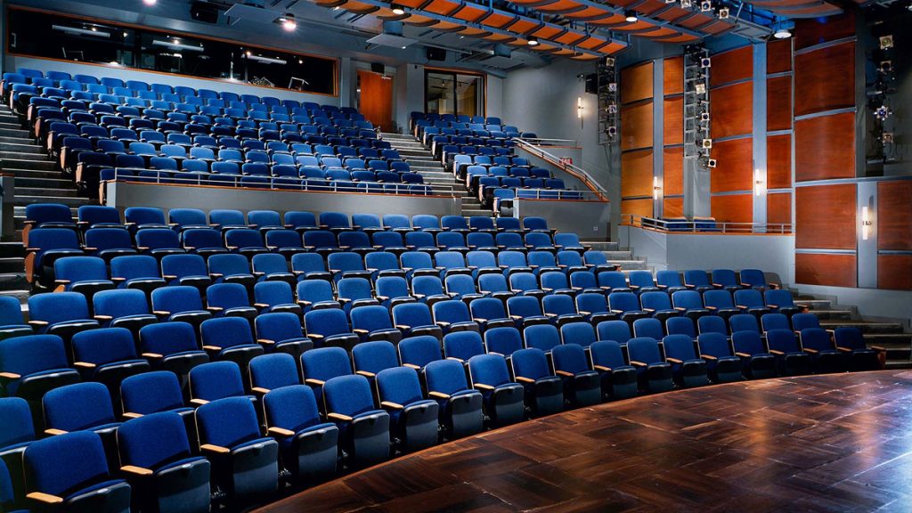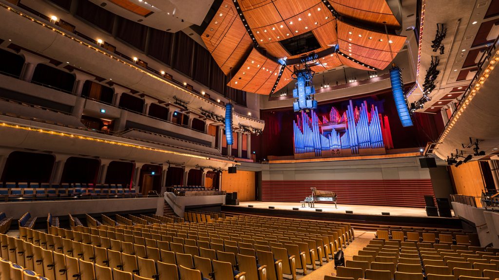 The hall features tiered seating and carefully engineered acoustics, including adjustable acoustic elements that allow technicians to tailor the room’s sound for different types of performances.