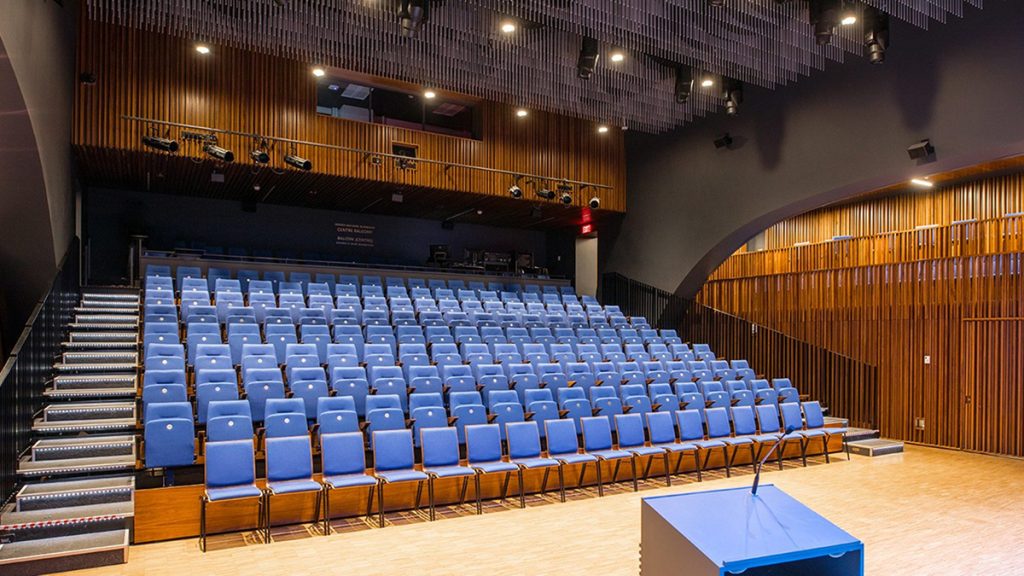 The space features tiered seating, ensuring clear sightlines for every attendee, and a professional audiovisual system that enhances both sound and visual production.